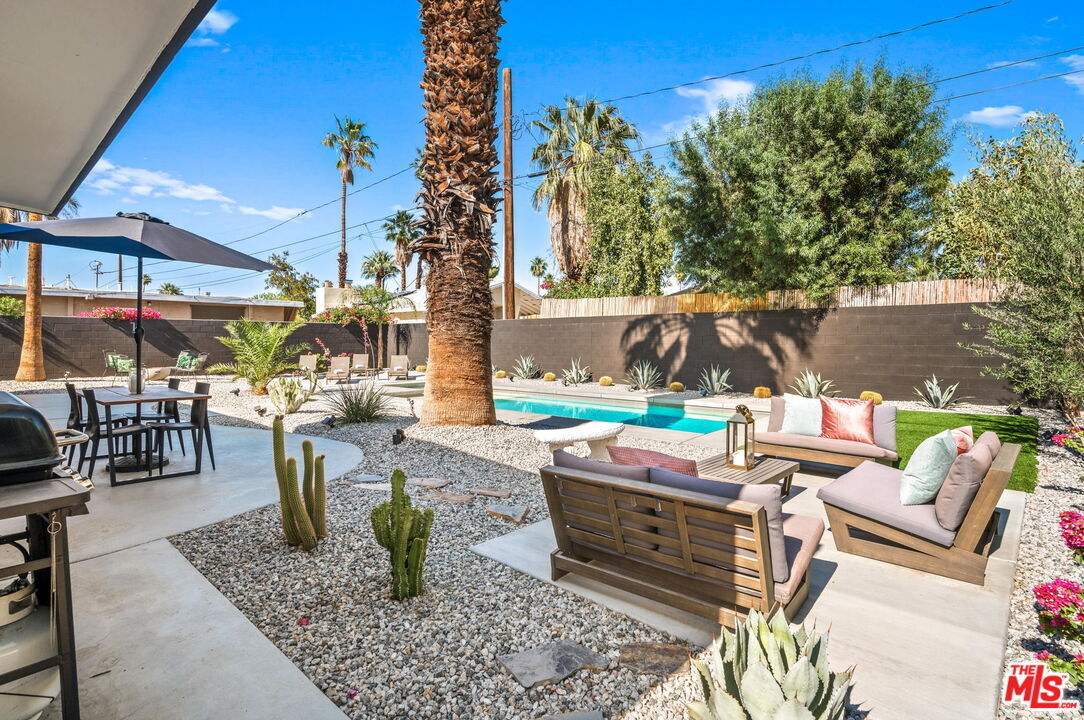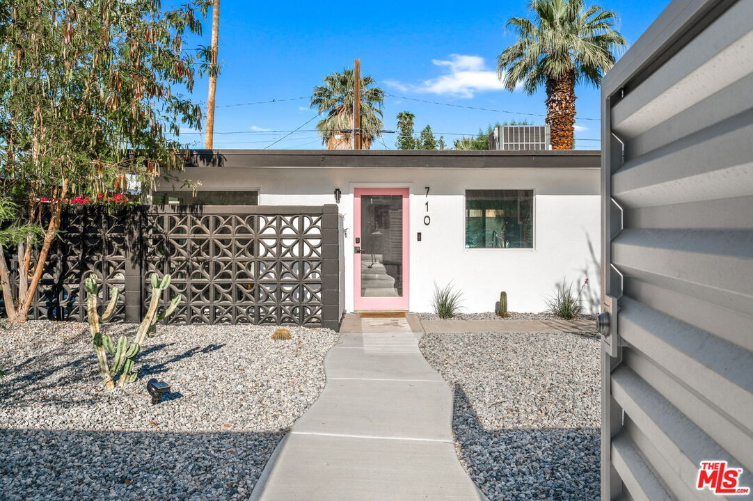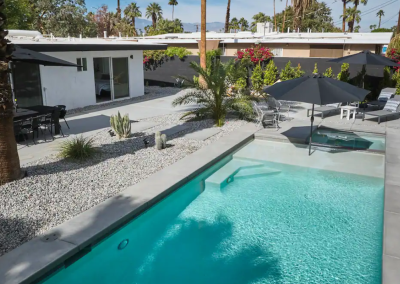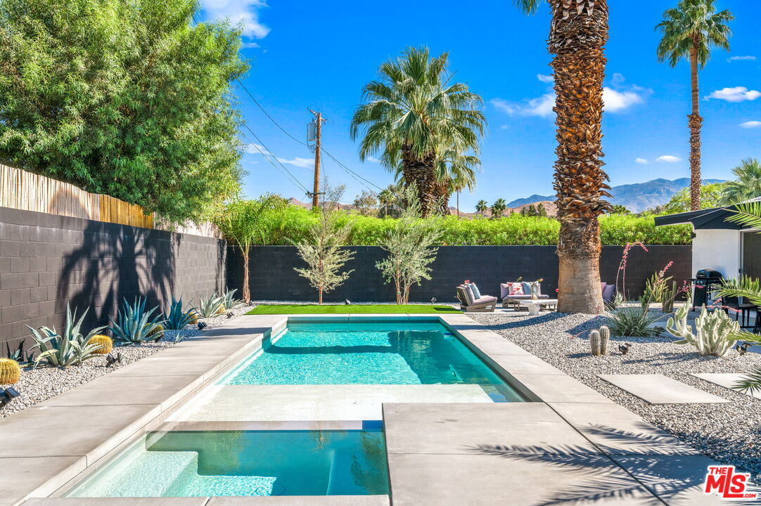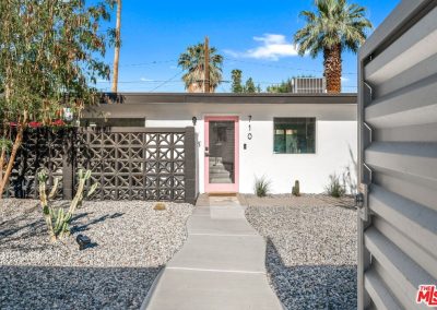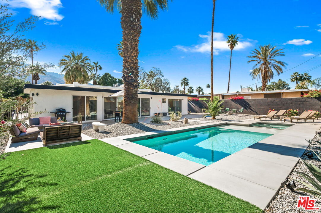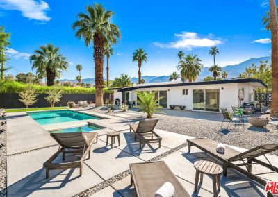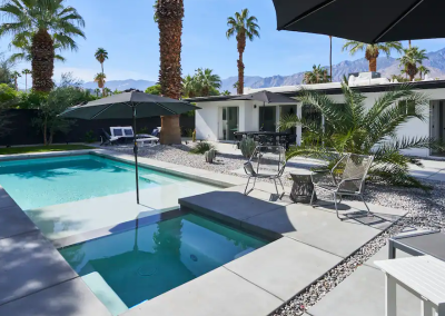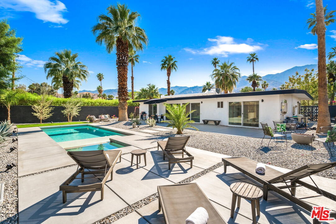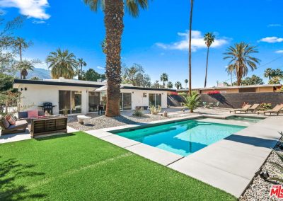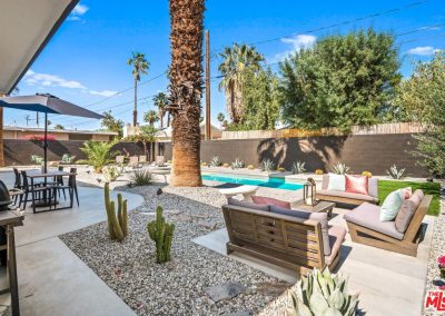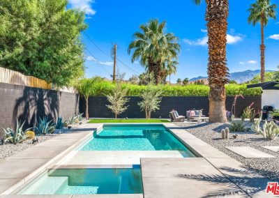 A private mid-century compound designed for fun and relaxation. Located on a large lot (FEE land) on a cul-de-sac street, in one of the most convenient neighborhoods in South Palm Springs, only minutes from downtown, and just one block away from Demuth Park! This custom home showcases a newer remodel that respects its heritage while complimenting it with beautiful design and today’s preferred appointments. Featuring four bedrooms and two bathrooms, this open concept home is an entertainers dream and would make an excellent weekend getaway, forever home, or vacation rental. In fact, this home has a very successful short term rental history, with nothing but five star guest reviews. Enjoy iconic mountain views from your private backyard with a newly built heated pebble tech pool / spa with smart phone automation, fire pit, and multiple entertainment zones. Come see to appreciate, you don’t want to miss this one!