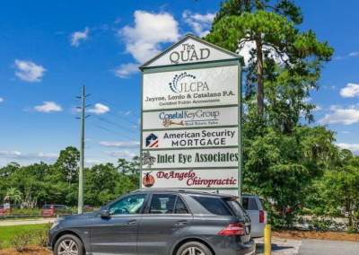 Premium office lease opportunity at The Quad in Murrells Inlet, South Carolina. Located on Hwy 17 Bypass at the very southern end of Murrells Inlet, The Quad is the south strand’s premier business center designed to inspire a one-of-a-kind business community. Fantastic exposure for any professional business plus supportive business neighbors. The Interior features are: Front Desk reception area with desk, separate storage filing space, conference center media board room w/double pocket doors, 3 additional separate offices one has a full bathroom, 2nd bathroom and a kitchen area/break room w/sink and cabinets, and mechanical room w/ utility sink. All finishes are premium quality. This office location has 4 access points.